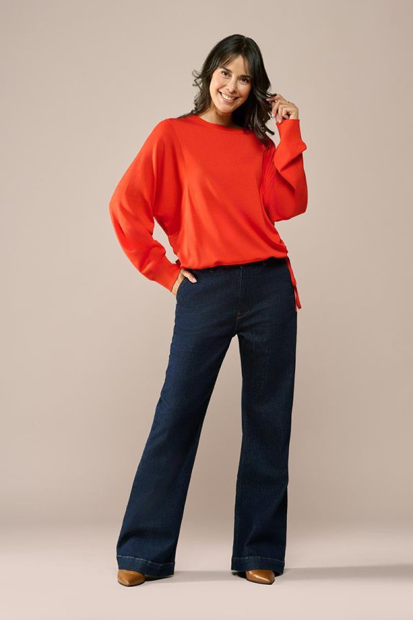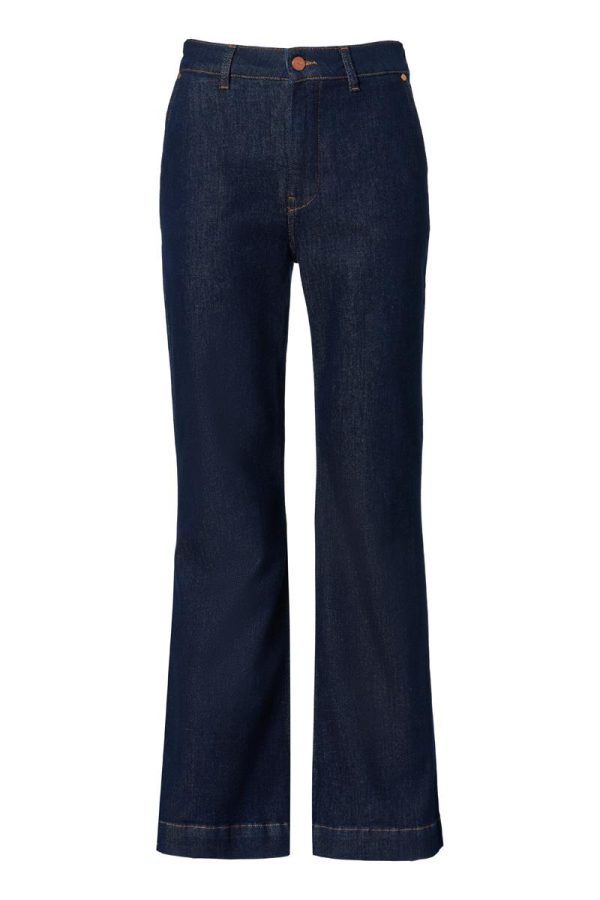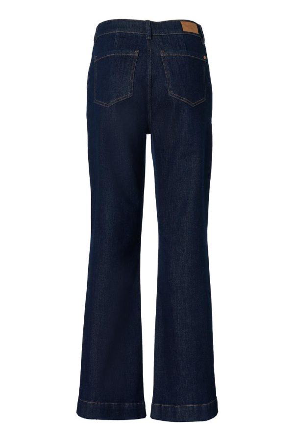 - Flared jeans in dark denim met geborduurd detail op de achterzak en schuine steekzakken voor Manon heeft een lengte van 175 cm en draagt maat M