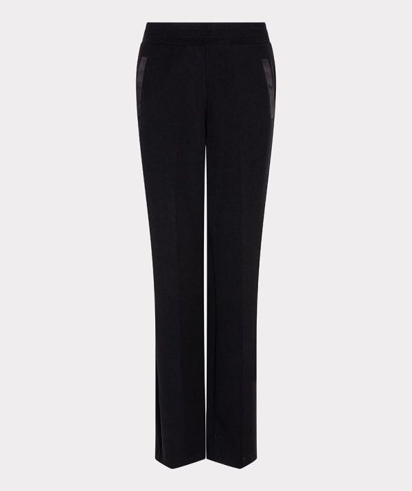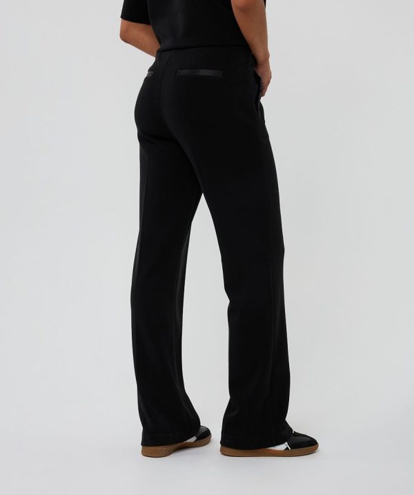 De broek heeft een elastische tailleband en heeft een satin look detail bij de steekzakjes voor en bij de paspelzakjes aan de achterzijde.