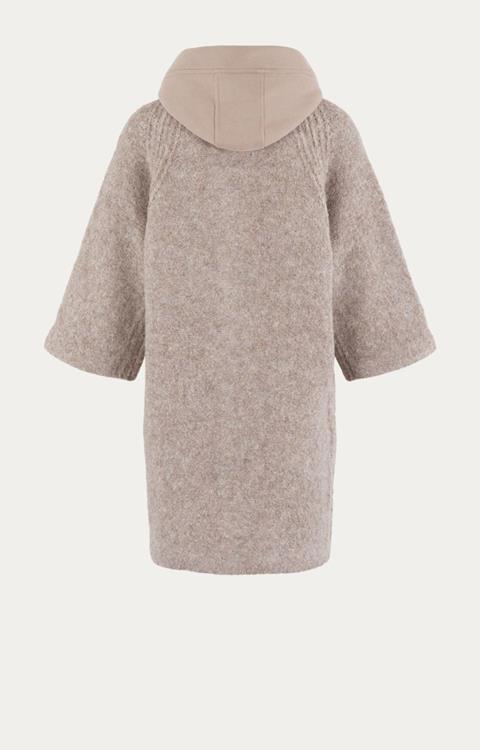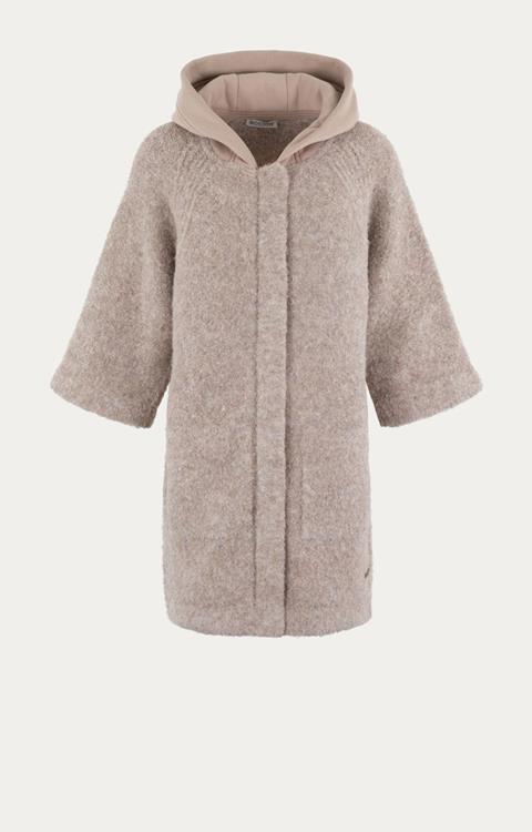 Kenmerken: Jersey capuchon, gebreid vest, schuine mouwinzet, rechte driekwart mouwen, gemêleerd taupe, rits- en drukknoopsluiting, vierkante steekzakken
